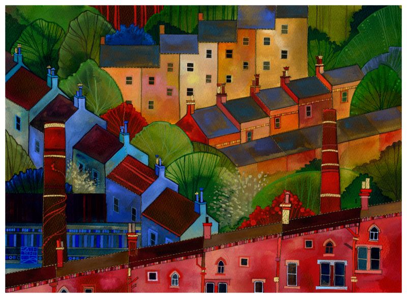 A view of the steep terraces of Birchcliffe, Hebden bridge. Birchcliffe terraces always seem bathed in sunshine, and the roofs reflect the colours of the sky against the warmth of the stone.